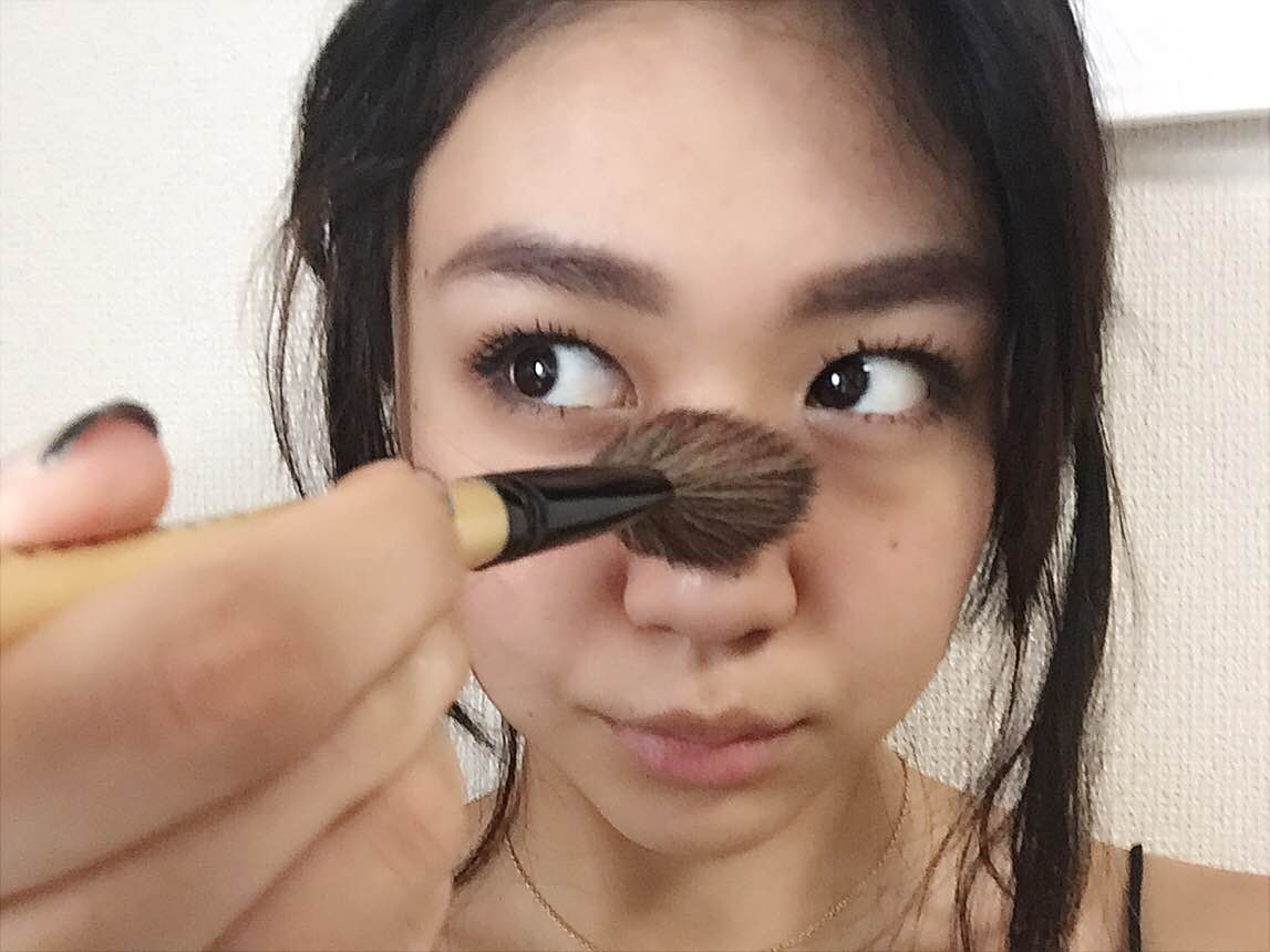 ▼こんな感じでもうがっつり鼻の上にも塗っちゃう!この写真のブラシの両延長線上(目の下とまではいかないけど、頬骨らへんに直線で。丸く描くというよりは、横棒一直線くらいの勢いで!日焼けするときって顔の高い部分から焼けていくから、いつもチークを乗せてるほっぺの部分よりもちょっと高い位置にある頬骨らへんが赤いと あれ?ひやけした?って感じになるよ!結構強めにいれてもいいかな。