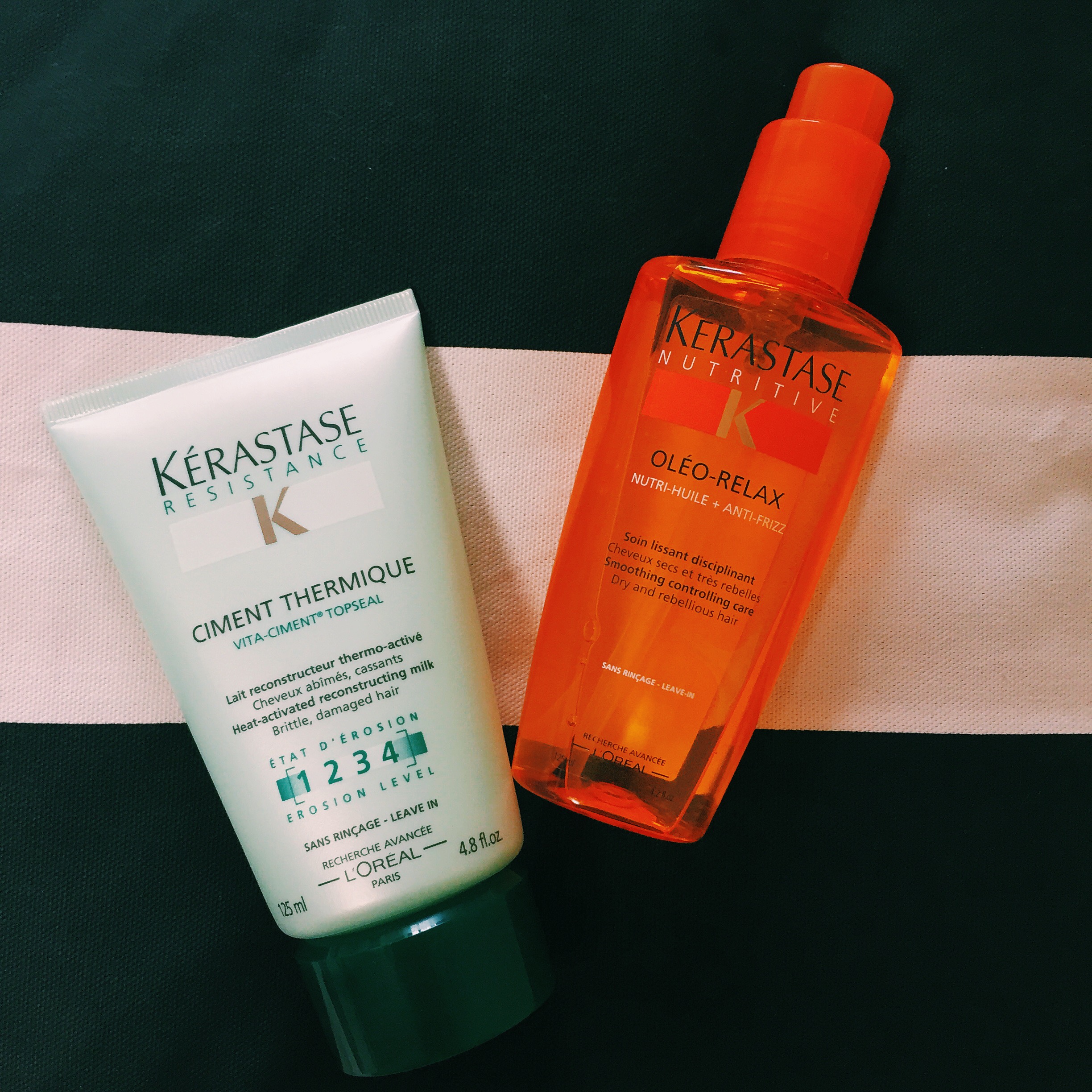 In the mornings, I use KERASTASE Ciment Thermique- the one you don’t have to wash off.