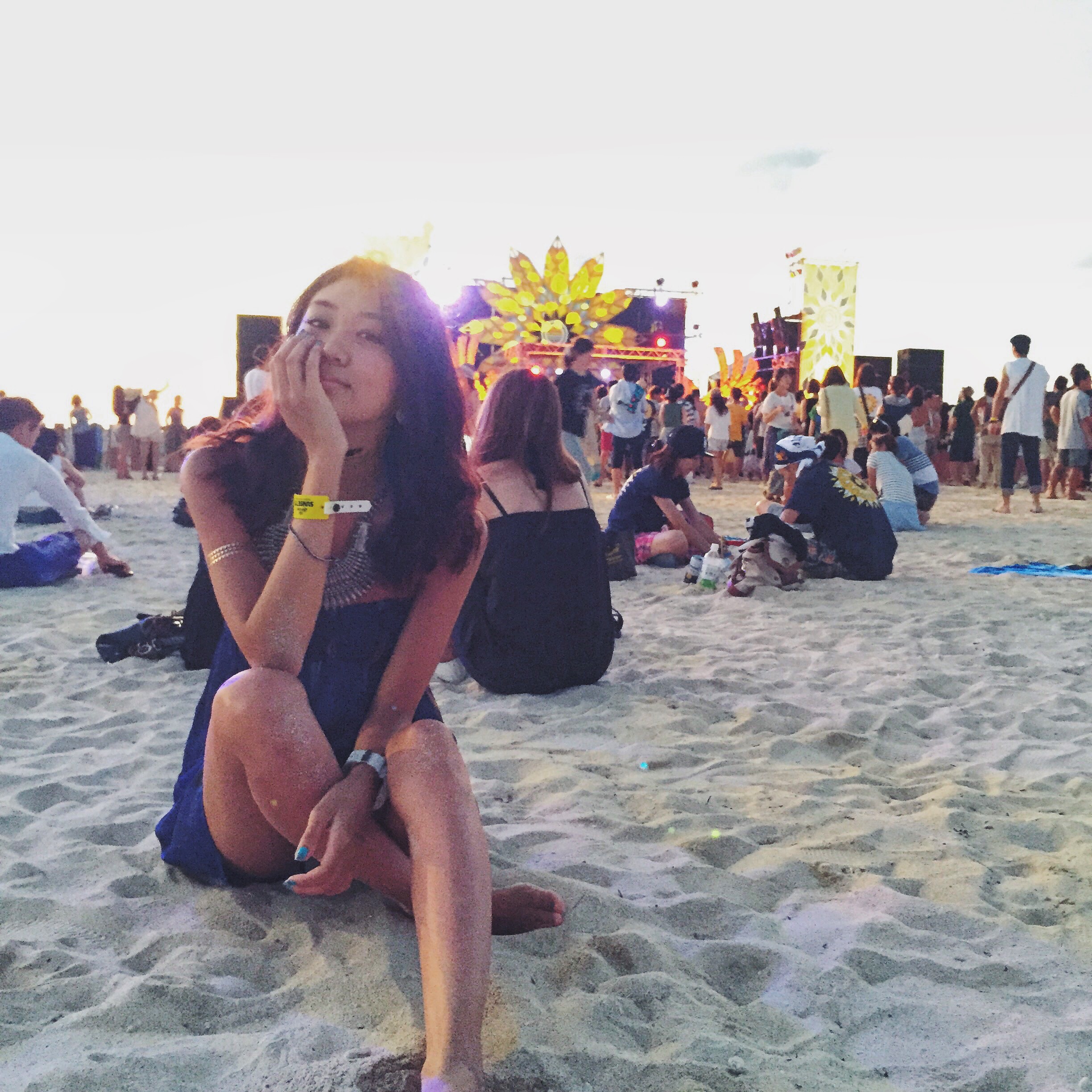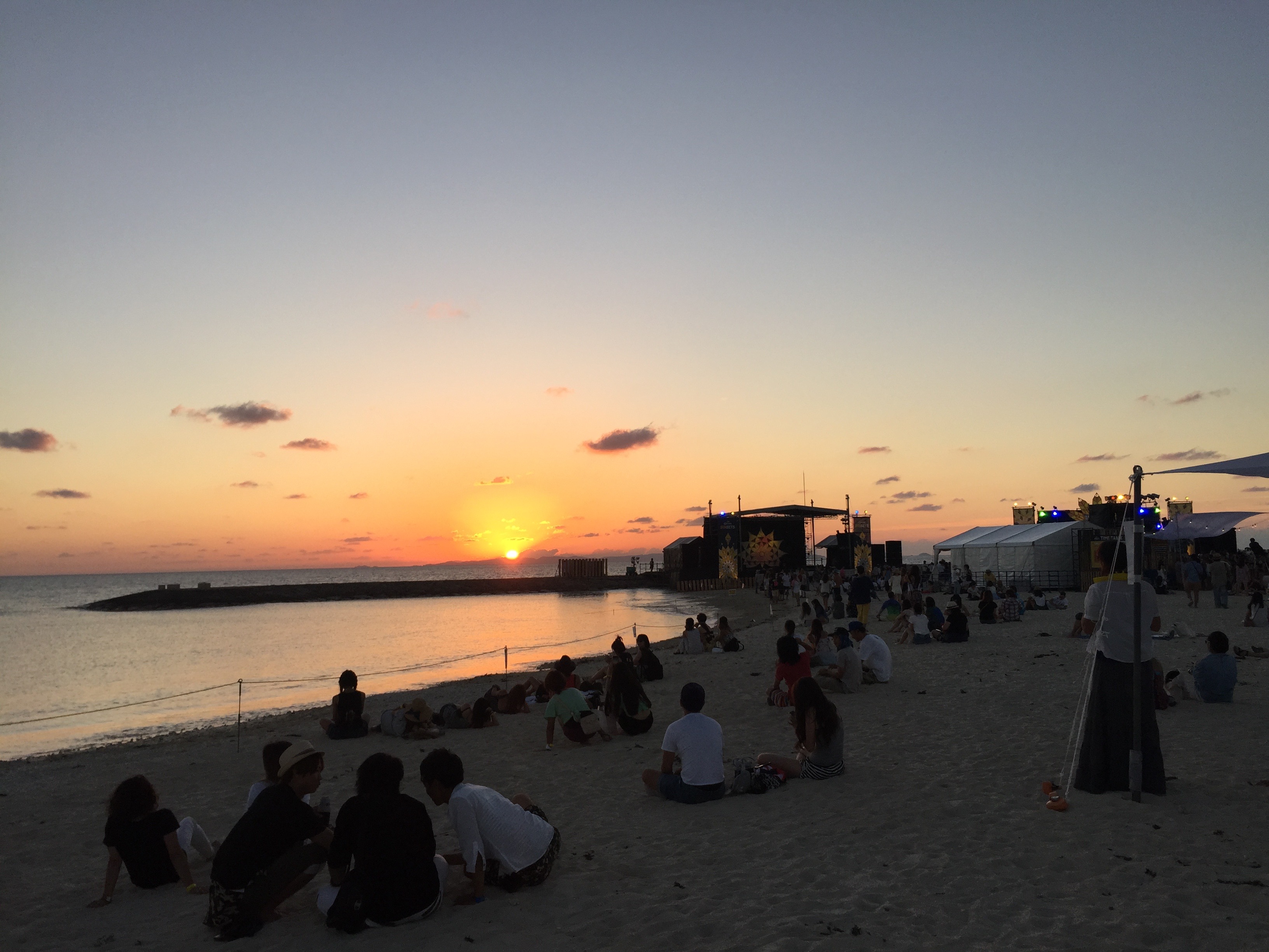 ちょうど夕方時に行って、浜辺での野外フェスだから海に沈む太陽が眺められて。