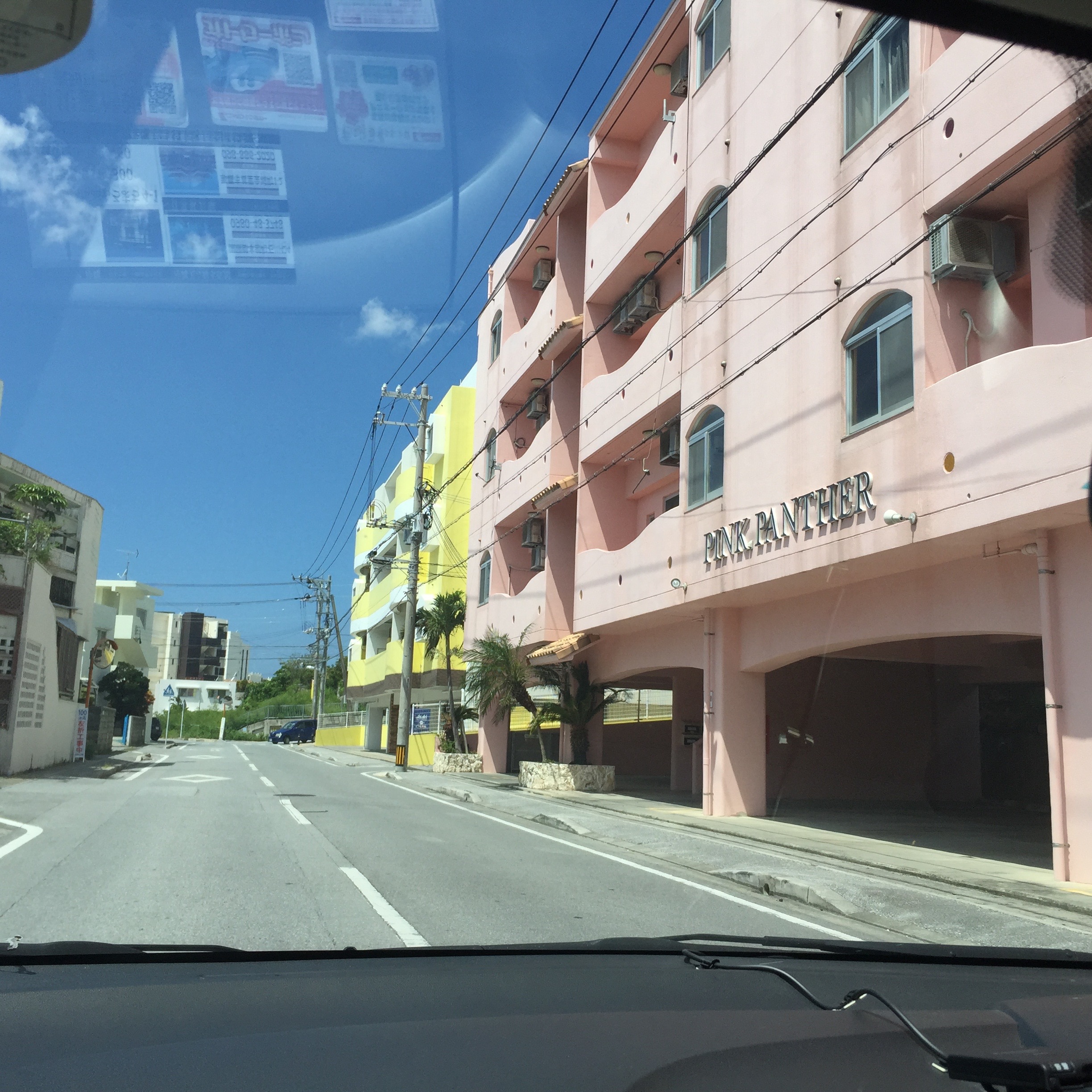 この辺は、米軍の人が多く住んでいたりするから景色が日本じゃないみたいでドライブしてても超楽しいよ。このピンクとイェローの建物とか、すごい可愛いでしょ〜!
