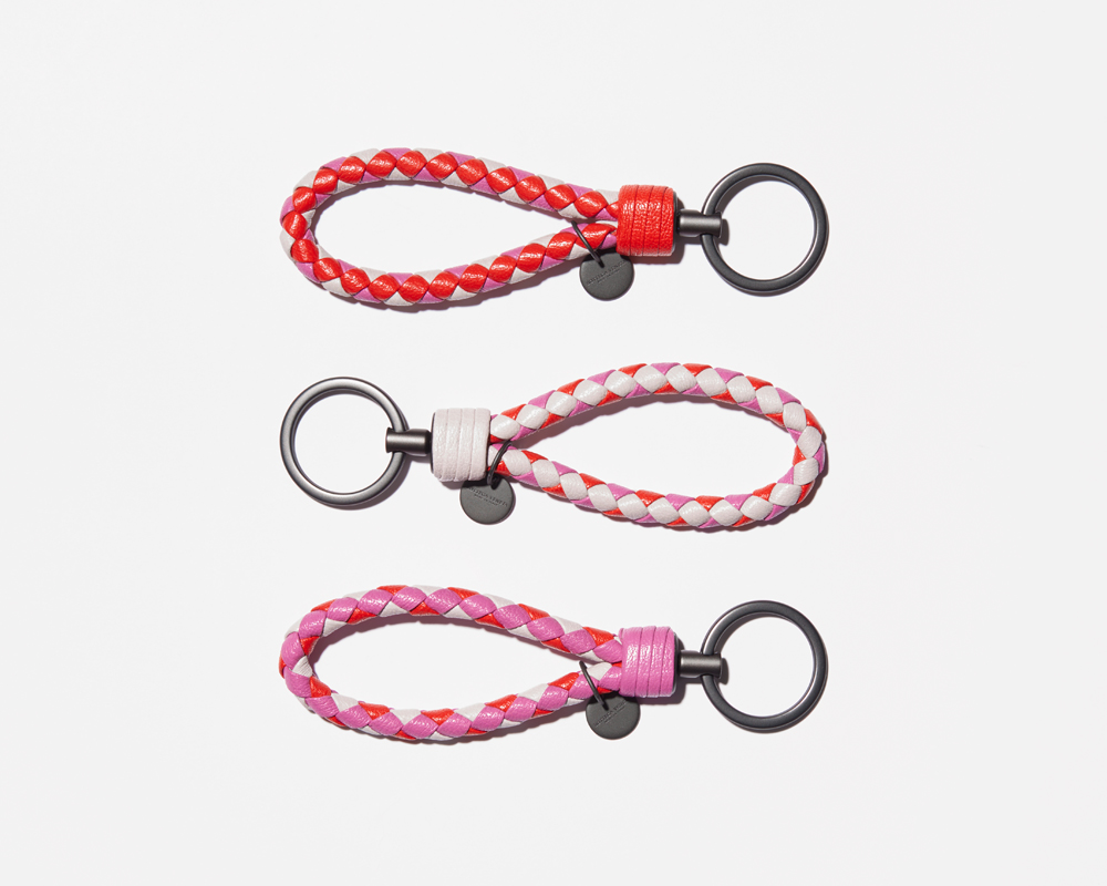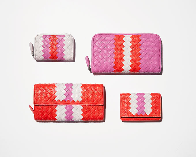 こんなかんじで、白とピンクと赤の三色を組み合わせたデザインのミニショルダーバッグ、ウォレットとケース、キーリングが出現。クルーズコレクションにぴったりな、華やか&ラブリー&ポップな色使い。これぞクルーズって感じ。今まで黒茶系統のボッテガしか見たことがなかったから本当に新鮮だし、急に購買意欲がガンっと上がってくる!