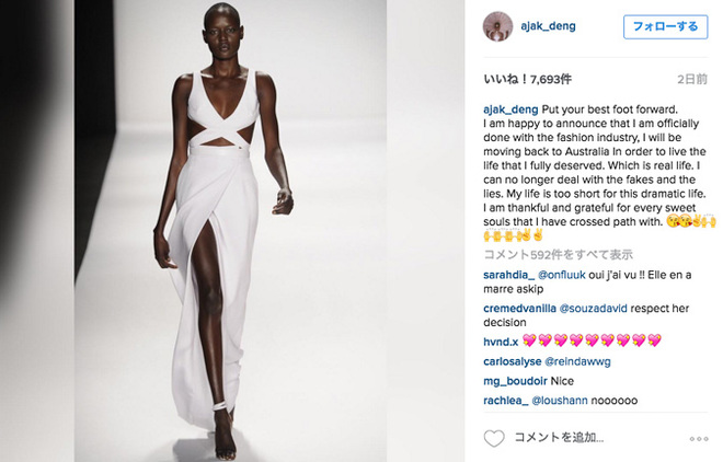 また、fashionsnap.comでこんなニュースも発見。スーダン出身のオーストラリア人モデル、Ajak Dengさんが白人至上主義のファッション業界に嫌気がさして、とうとうモデルを引退したというニュース。