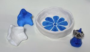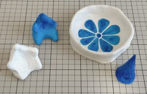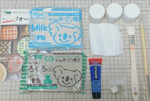 オーブン陶土「Milk」・オーブン陶土「ろくろ」・コート剤Yu・化粧土白・絵の具藍色・空容器・平筆・彩色筆・ガーゼ・テキスト本・焼き見本