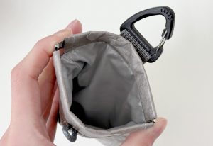 持ち運びやすいサイズ感でバッグの中には勿論、カラビナ付きなのでバッグのショルダーやハンドル部分にぶら下げることが出来ます。