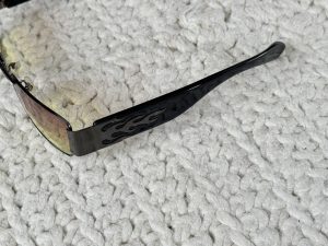 Jean Paul GAULTIERのサングラスは古着屋で購入したもの。横にはファイヤーパターンが入っていて存在感がある一品。