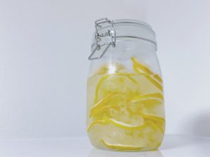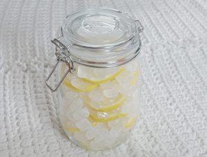 密封瓶を煮沸処理、レモンの輪切りして、瓶の中に氷砂糖と交互に入れていきます。