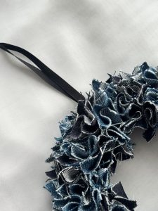 背面を隠したい方は先にリースのサイズに合わせてドーナツ状に生地を切り、周りと中の穴に切れ込みを入れ、接着剤を塗って貼り付けます。