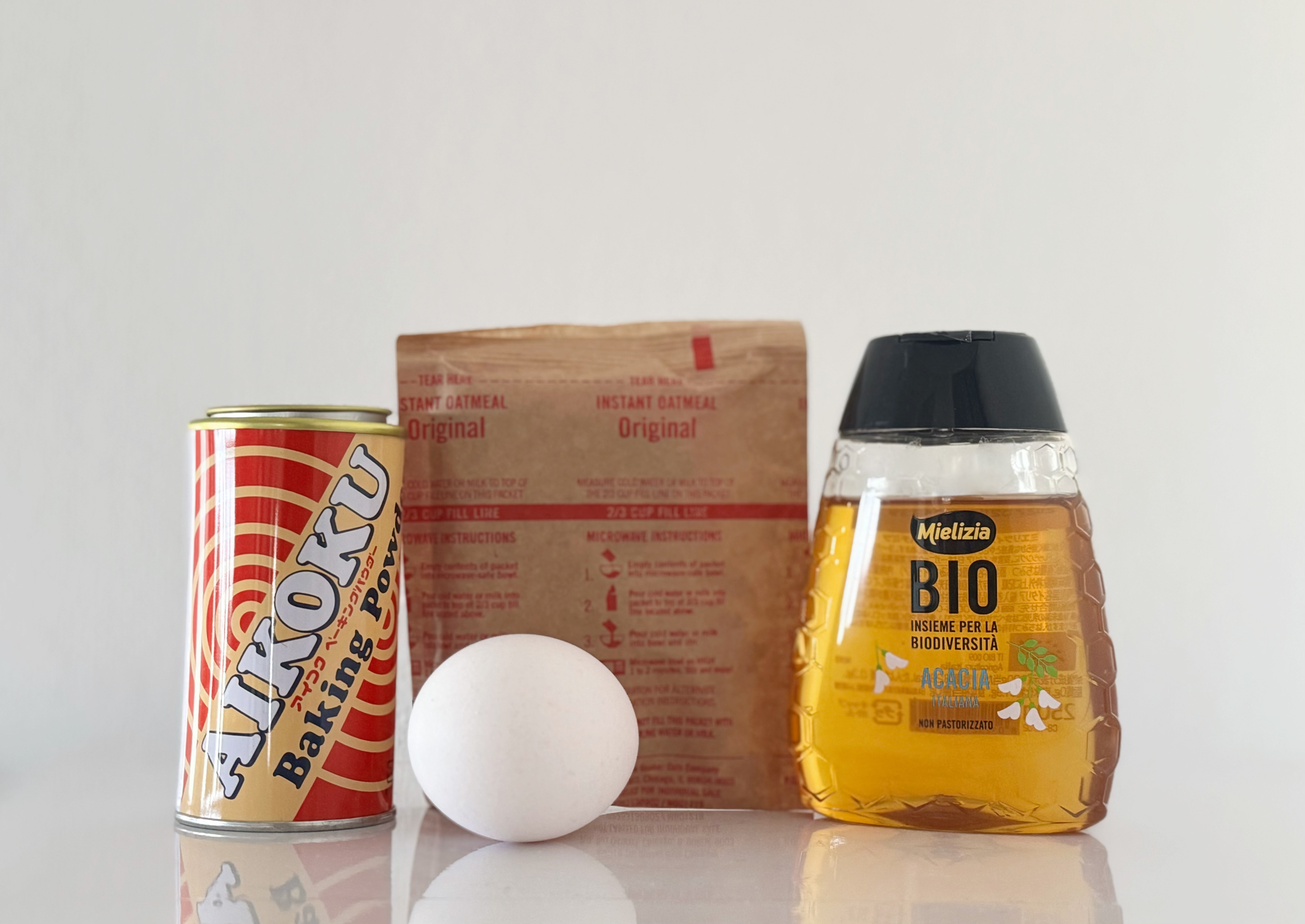 左からベーキングパウダー・卵・オートミール・はちみつ
