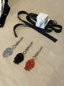 中西が学生時代に作成していた「裂き織り」を使用したアイテムや、3Dデザイナーspecial effects artist 七七と制作したヘッドアイテム、