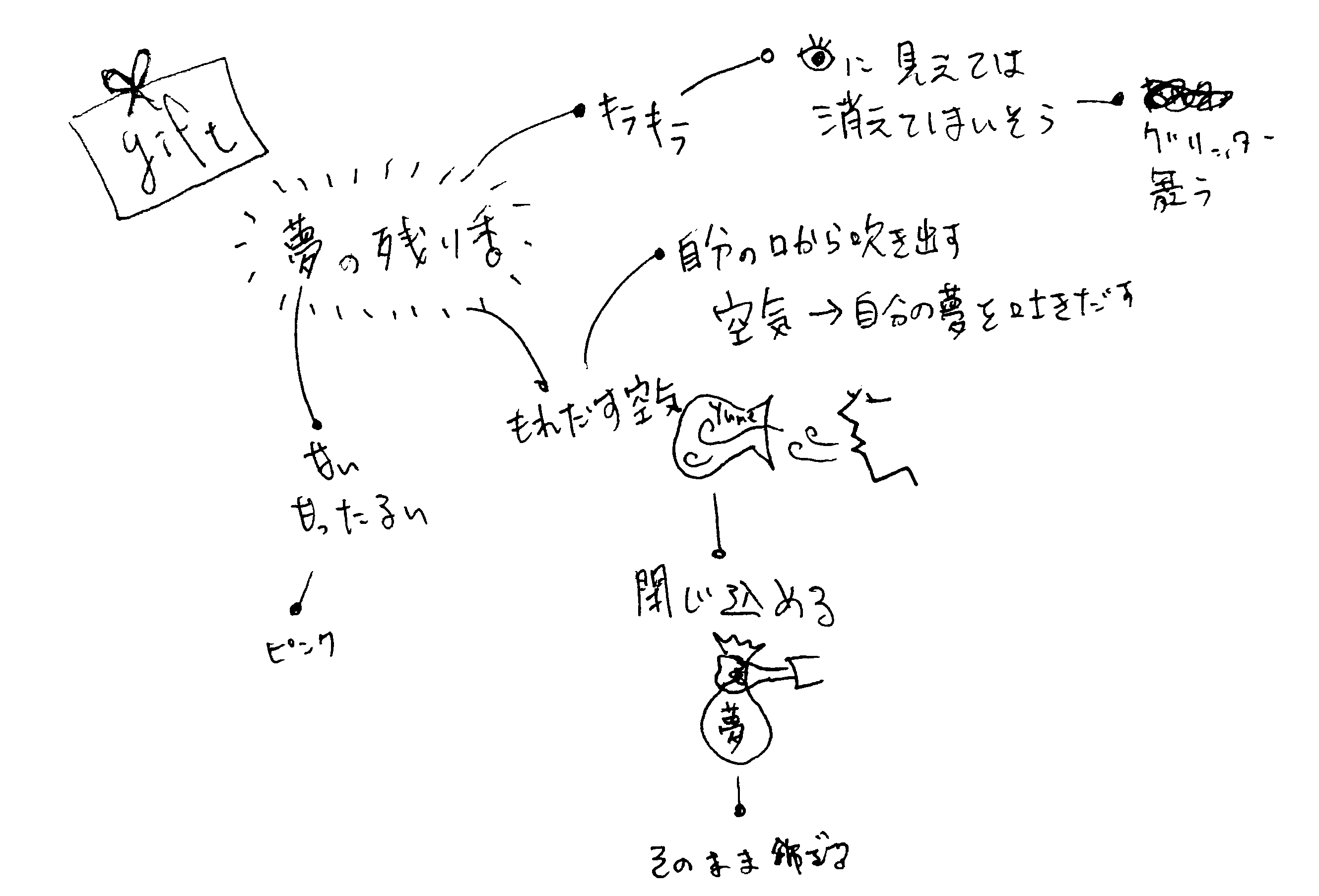 例えばGIFT ZINEでのアイディア。(GIFT ZINEの記事はコチラ)今回はギフトの方がわかりやすいのでコチラを参考に書きますね。こいつのコンセプトは「夢の残り香」です。まずは夢の残り香から抽出できる言葉を書き出していきます。例えば「甘い」、「キラキラ」、残り香だから「漏れ出すような」など。そこからその言葉を序所に具現化していきます。例えば「甘い」ならピンク色だったり、「キラキラ」はグリッターを使うとか、舞う感じにしたら夢っぽいとか、「漏れ出す感じ」は甘いと掛け合わせてものすごく甘ったるい香水で表現してみようとか、そんなこと考えています。そしてそれに似た画像をtumblrで集めてイメージを固めていきます。今回は文字からモノを考えていきましたが、画像からイメージを膨らましたり、はたまたアイディアから始まり、それを具体的にするために文字や画像を集めたりします。