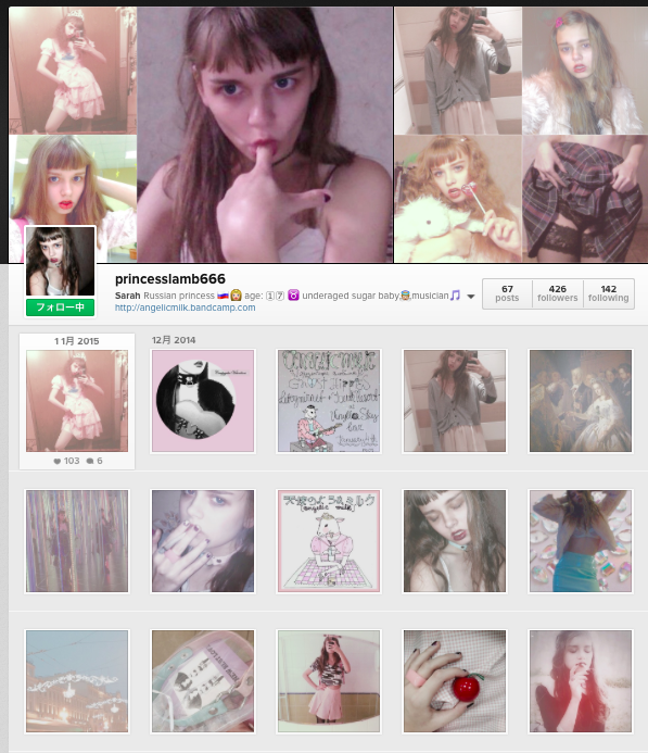 情報系のブログはあまり書かないのだけれど、今回是非皆様にシェアしたいものが出来たので書く事にしましたXDinstagramを練り歩いていたら、突然見つけた可愛い女の子。よくよく検索すると彼女は”Angelic Milk“というバンドのシンガーでした。instagramから発見したバンドなので色々と不明なのですが、どうやら3ピースバンドみたい。思うにおそらくロシア??だと思います。ちょくちょくどこかでライブはしているみたいだけど、是非生でみてみたい!!動画にあるDa:Da:はプロジェクターとの演出がとても素敵。ドレスにギターという組み合わせがholeを一瞬思い出させるけど、holeともまた違う感じ。ロリータフェイスにギター、渋い重層感のある音が個人的にツボです。ripped jeansという曲かなり好き!!都合上直接リンクは貼れないのだけれど是非”Angelic Milk“をしらべてみて!!とても素敵です!!