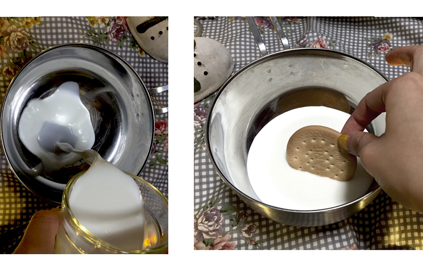 1、牛乳を広めのボールに入れ、ビスケット12枚を軽く、牛乳にくぐらせます。長すぎるとボロボロ崩れてしまうので、1分程度で皿に上げてしまいましょう。