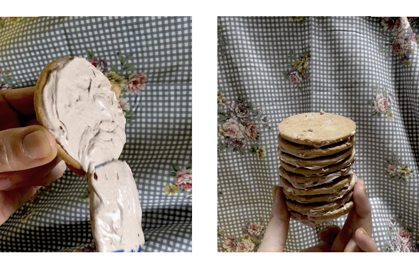3、ポイップクリームが出来たら、ビスケットの片面にクリームを塗り、12枚をつなげていきます。すべてつなげたら、皿に置き、壁面のクッキーが見える部分を隠すように塗っていきます。