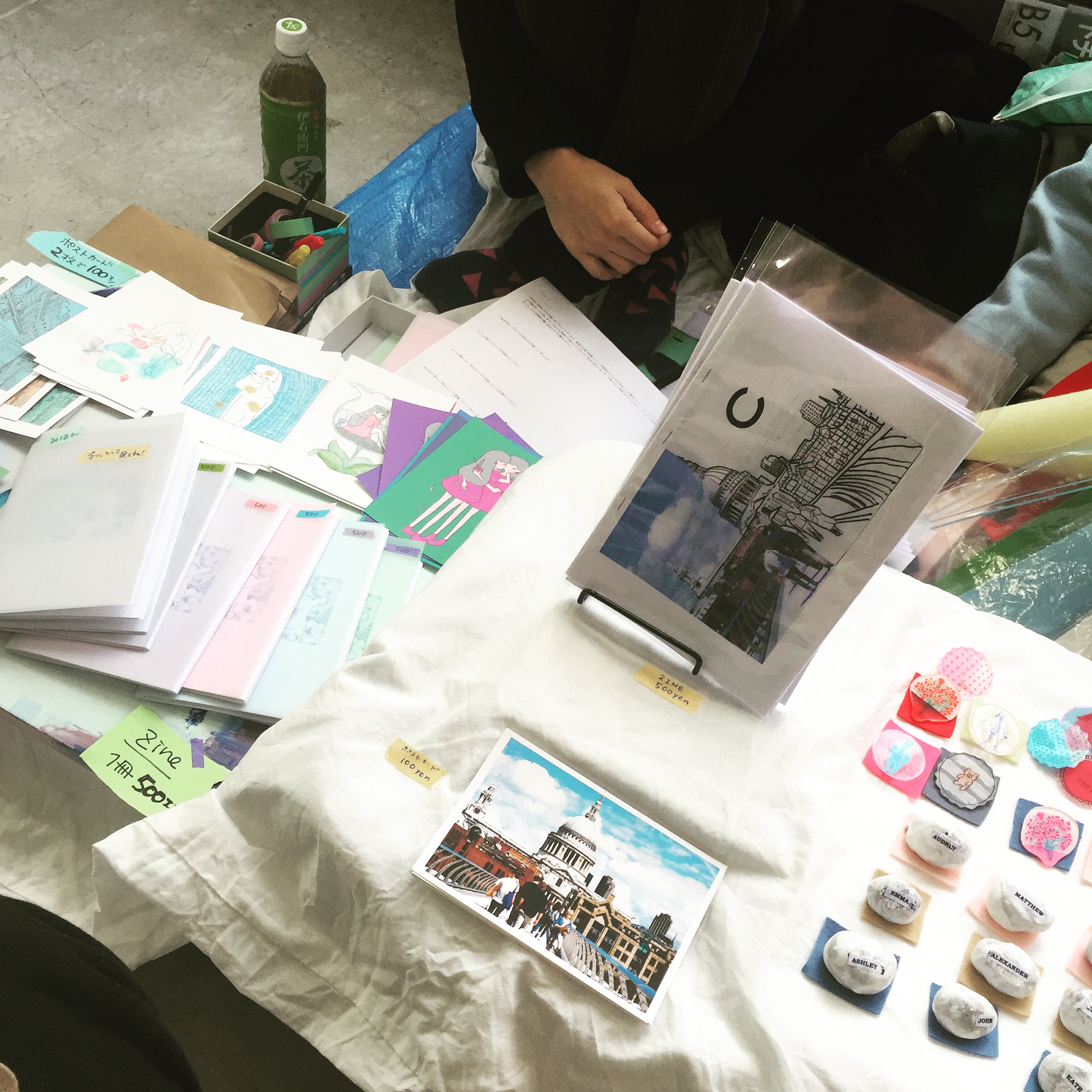 販売したものはZINE、トートバック、アクセサリーなどなど。彼女も一言で可愛い!!といって収まらないほどマイワールド前全開<3ZINEもポイントでリボンがついているのか、ピンクチェックな敷物とか、すべてが可愛かった!!淡いパステルカラー好きにはたまらない世界感です!![]()