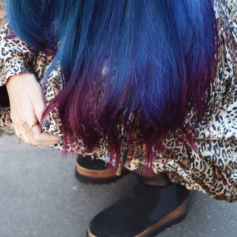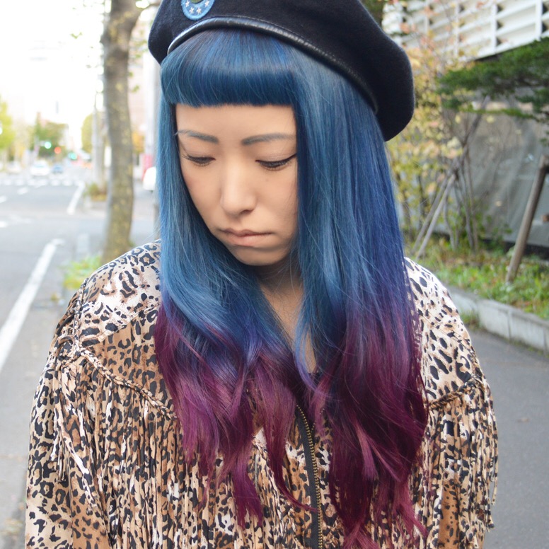夏からのネイビーヘアはそのままで暗くトーンダウン。そして、5年ぶりぐらいに暖色系のカラーを毛先にいれました。