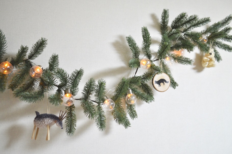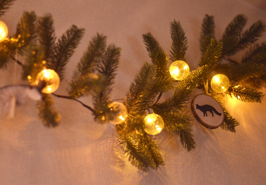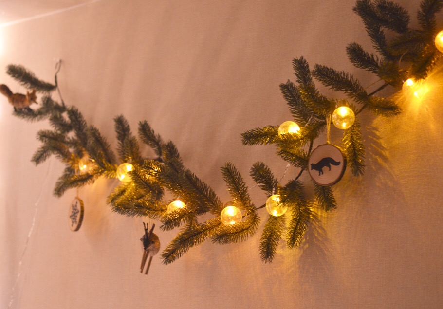 クリスマスツリーと同じ素材で出来た長いリースを壁にかけて、LEDライトを巻き付けてみました。