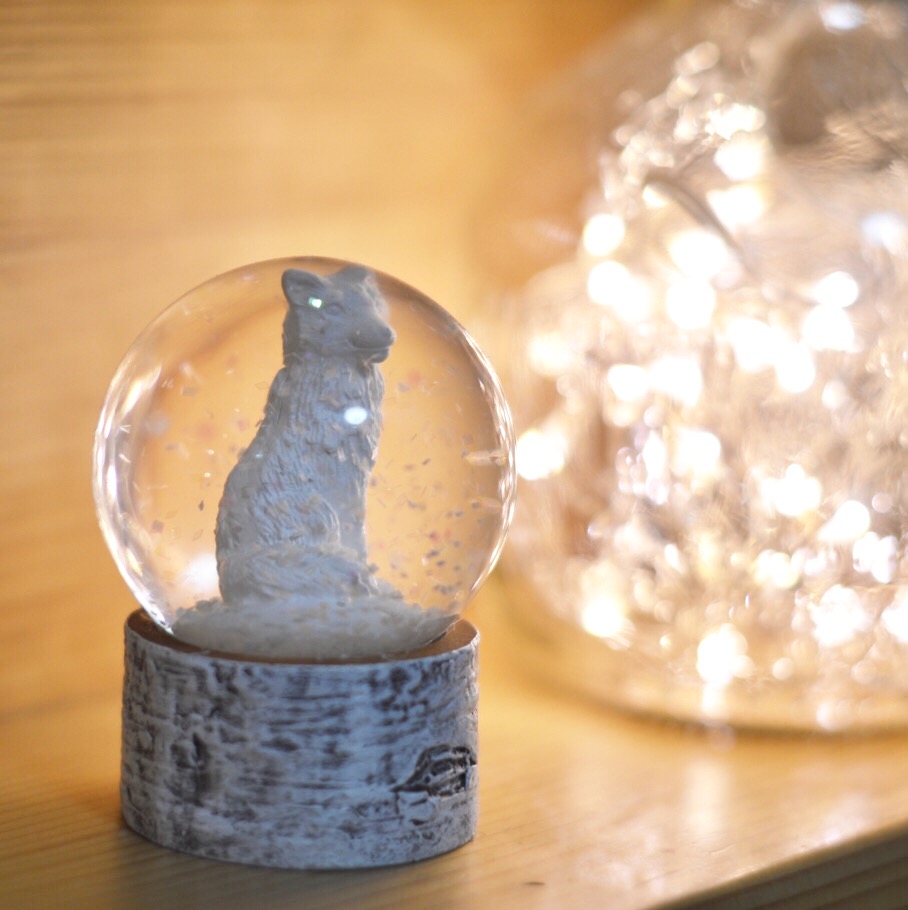 切り株の上に立っている狼のスノードームもニトリでゲット。シカのスノードームと2個セットで400円もしませんでした。