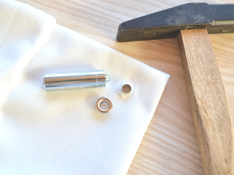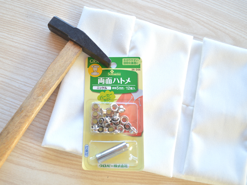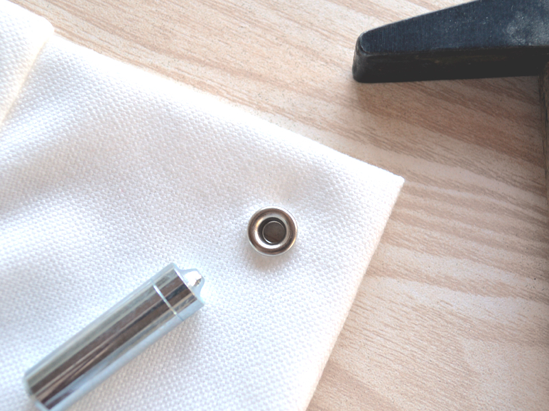 ハトメパンチを使う方法もあるけれど、今回はハンマーで打ち付けるタイプを選びました。