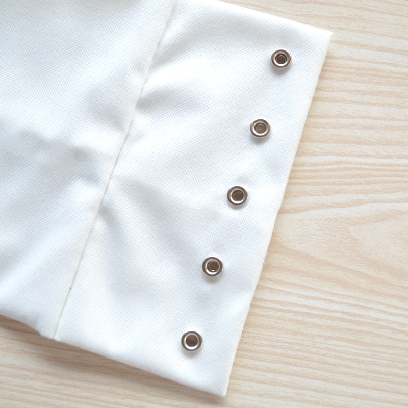 穴があいたらハトメを取り付けます。この時、うまく穴が開かなかったらハサミで小さい穴を作っても大丈夫です。