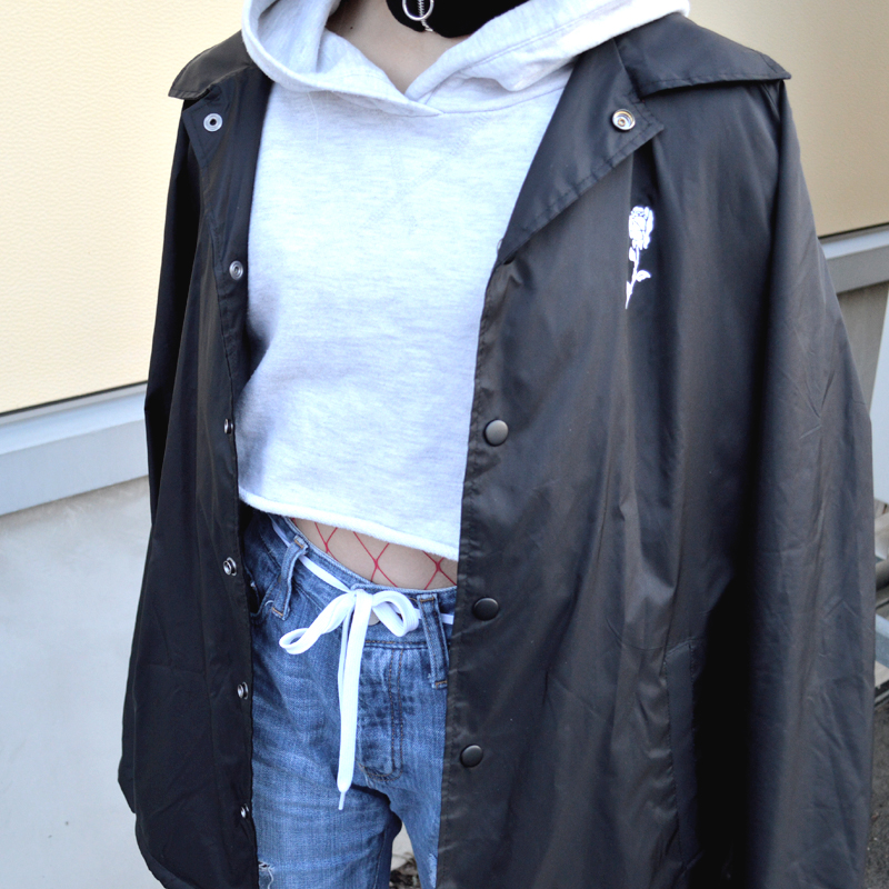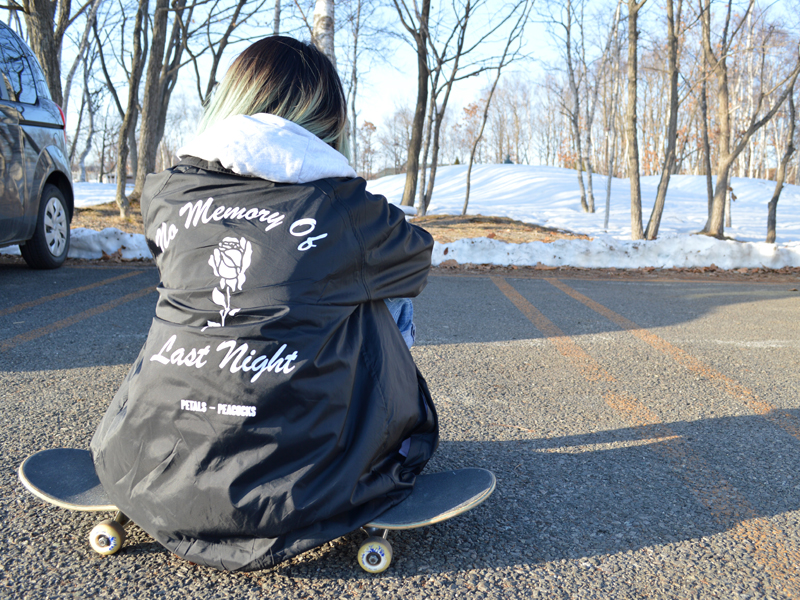 Petals and Peacocksのコーチジャケットは”No memory of last night”というブラックユーモアなバックプリントがかわいい。裏地付きで厚みがあるしっかりした素材で寒さが残る今シーズンに重宝しています。