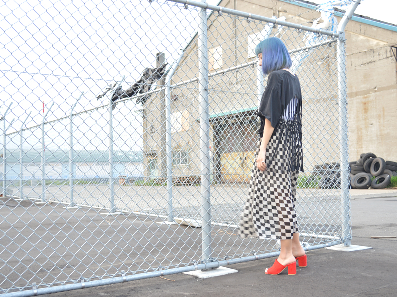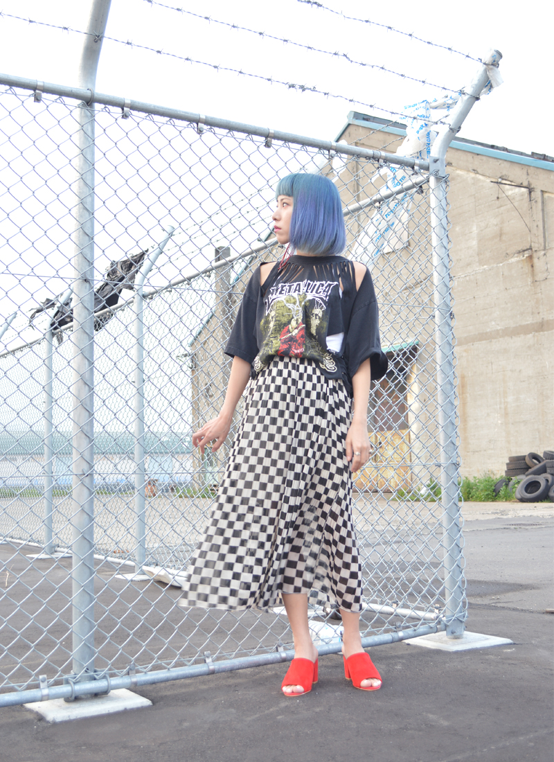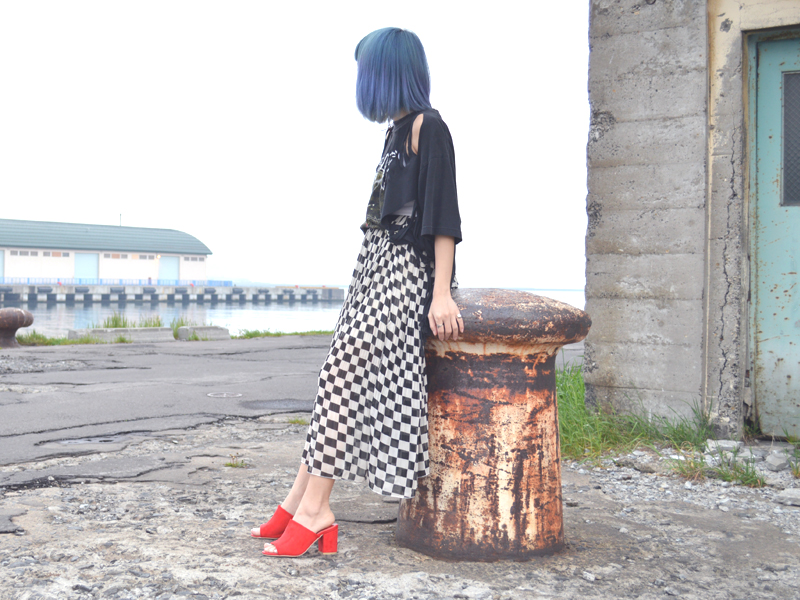 夏の定番でもあるバンドTシャツをシフォンスカートとミュールで女性らしく。かわいくなりがちなシフォンはあまり履かないのですが珍しいチェッカー柄に一目惚れでした。足元は赤いミュールで華をプラス。