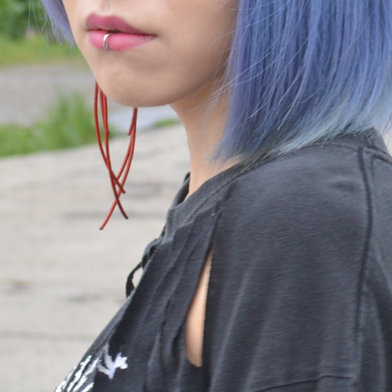 ちなみにピアスは私が以前働いていたセレクトショップのオリジナル商品。長さの違う3本のレザー紐を折り曲げただけなので試してみてね。