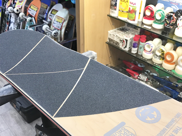 私はシンプルなのが好きなので今回もラインで遊んでみる。ノーマルデッキテープはシンプルに1枚で貼る人もいれば、ひと目で自分の板だってわかるように貼り方に特徴をつける人も多い。