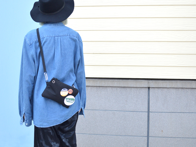 黒いシンプルなショルダーバッグはその日の気分でバッジピンを変えたりアレンジして楽しんでいるよ。