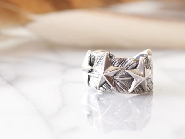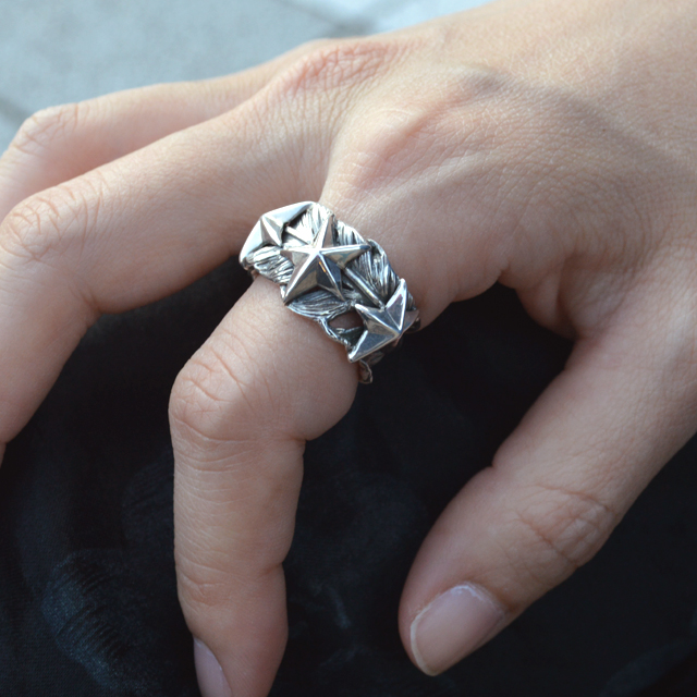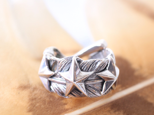 それは巻き付かれたフェザーの上にスターが3つ並んでいるリング。そのクォリティはとても素晴らしく裏面にまで繊細な羽模様が彫られている。