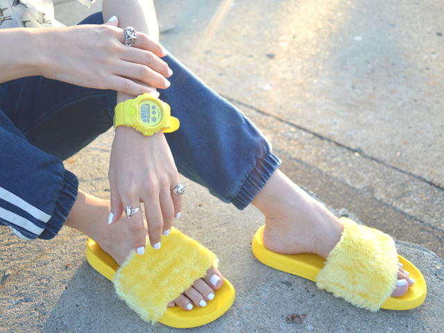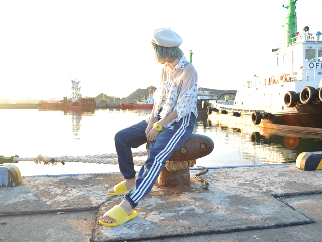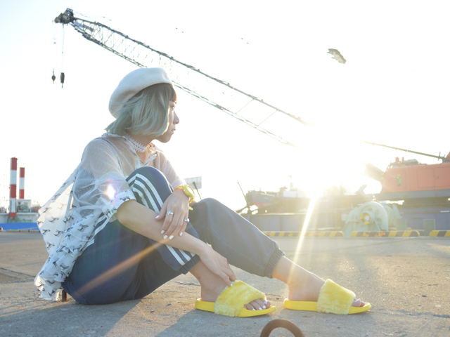 この日はイエローサンダルとadidasスウェットパンツ