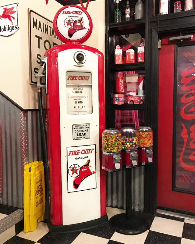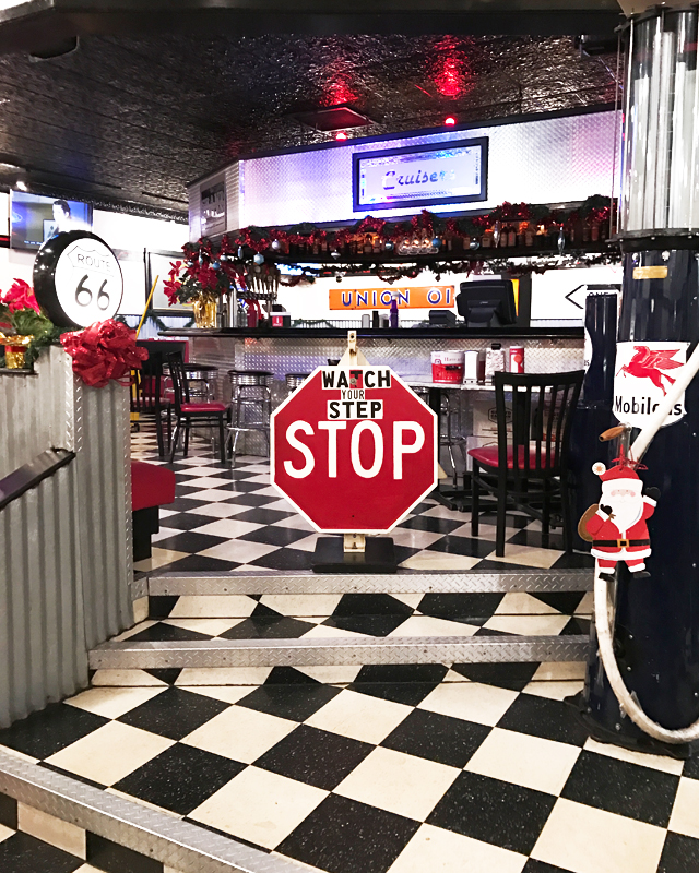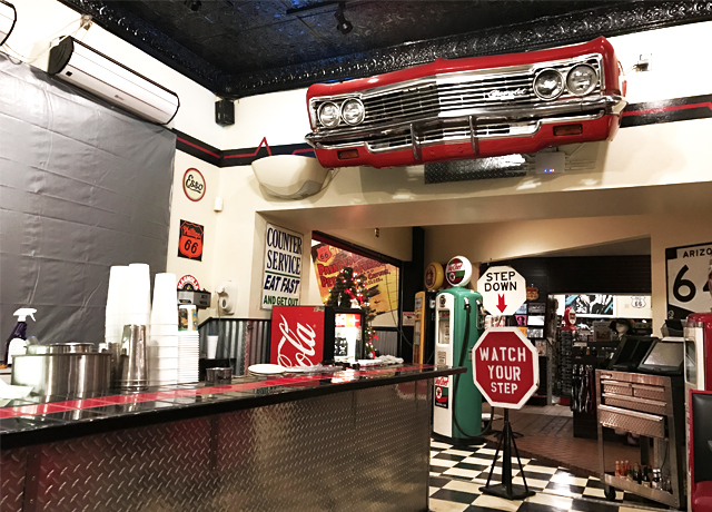 ダイナーではよく見かけるチェッカーフラッグ柄の床、かつてガソリンスタンドだったのを改造した店内はガソリンスタンドの面影があちこちに残っていました。
