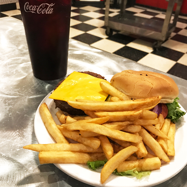 注文したのは、やっぱりダイナーの定番ハンバーガー。この旅で立ち寄ったダイナーのポテトはいつも食べきれなくて今回もテイクアウト。