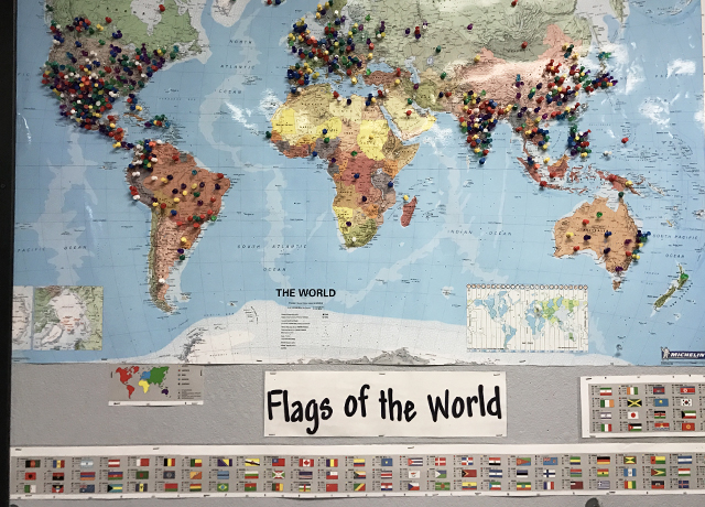チケットを購入する時に名前と合わせて出身地を書類に記入するのですが、壁にはこんな世界地図が掛けられていました。どうやら自分の出身地にピンを刺すシステム。