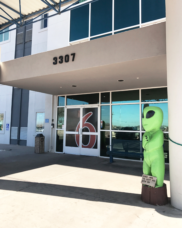 ロズウェルで宿泊したアメリカ大手チェーンのモーテル6もここでは宇宙人の像がお迎えしてくれました。