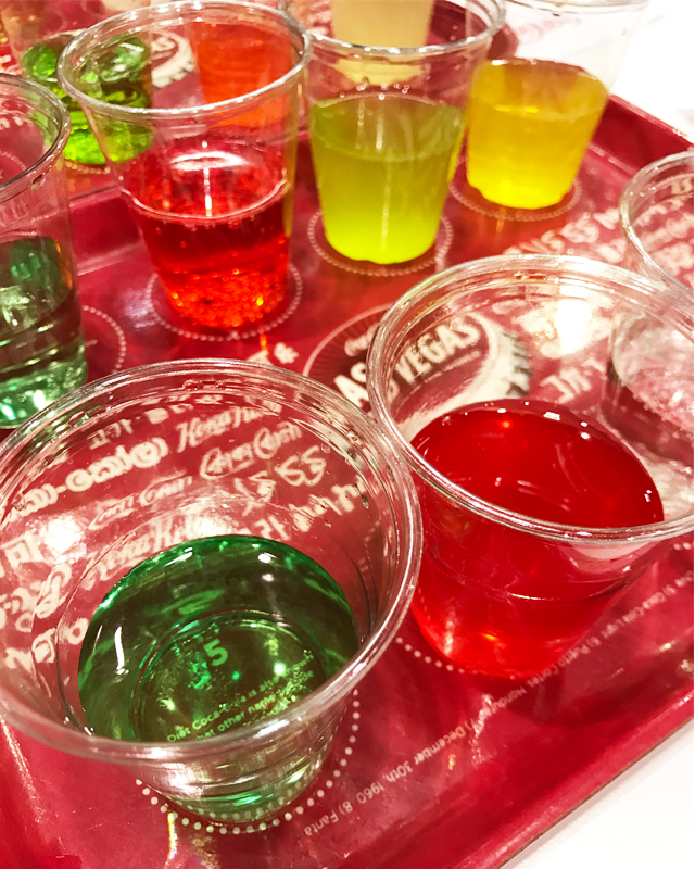 すると、なんと出てきたのは色とりどりのドリンクが並んだ2つのトレー。果たして飲みきれるのかな..