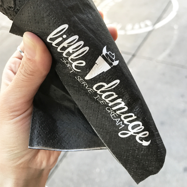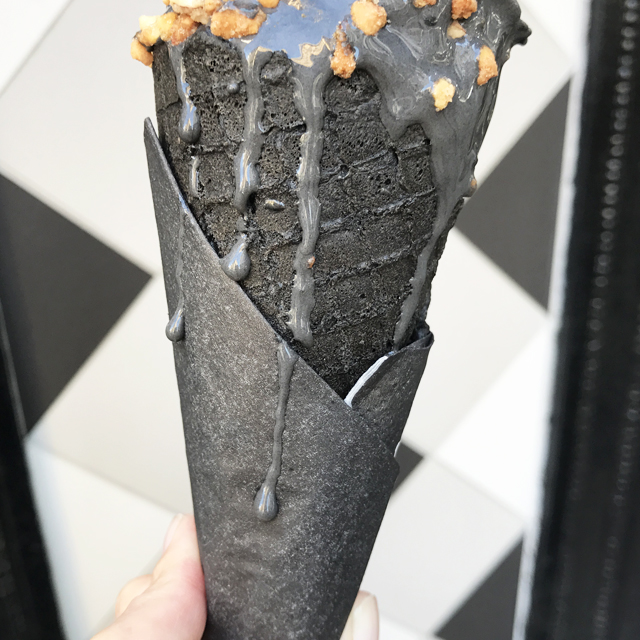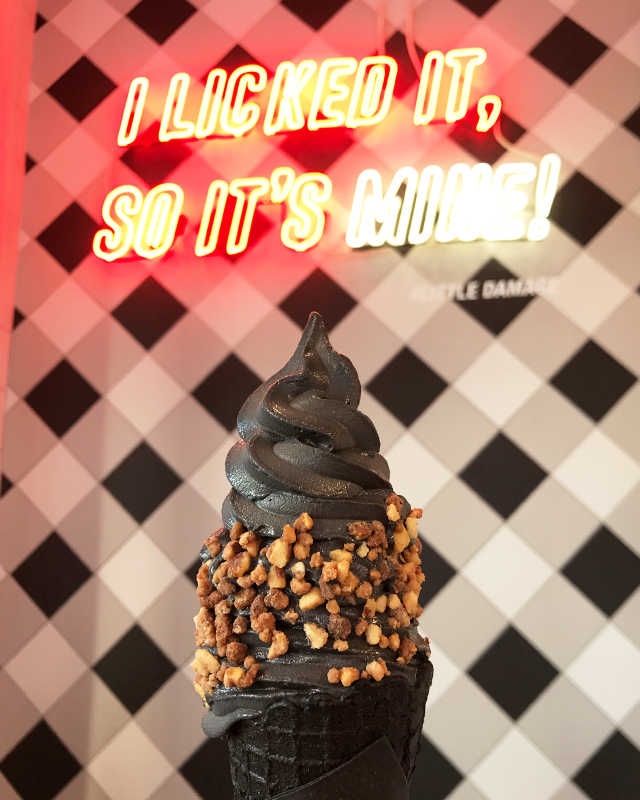 ソフトクリームだけではなくコーンもナプキンも全て真っ黒。別名Goth Icecream/ゴスアイスクリームとも呼ばれているとか。