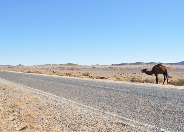 砂漠までのロードトリップでは、度々ラクダに遭遇することがある。
