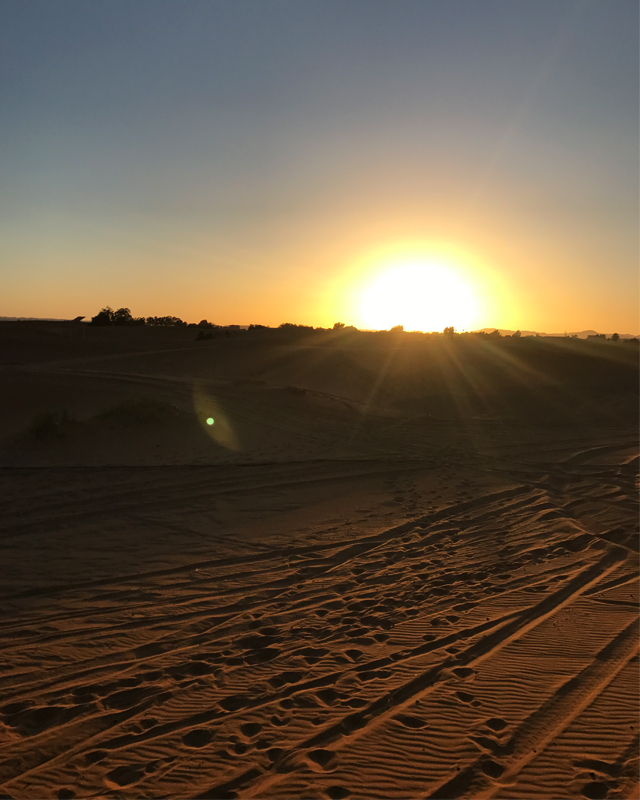 出発地点の宿も見えなくなり辺り一面は砂だけの世界。太陽が沈んでいきオレンジ色に広がる砂漠。だんだんと追っていく闇。
