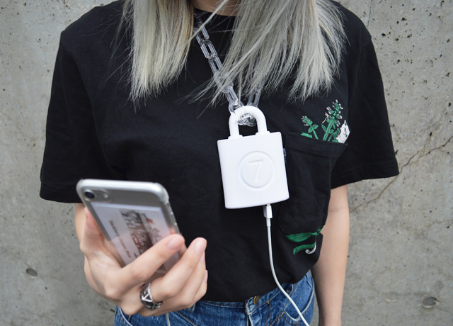 モバイルバッテリーにしては大きめサイズだけど、首やバッグに掛けれたり意外とこれが使いやすい。