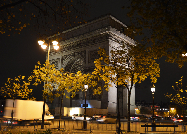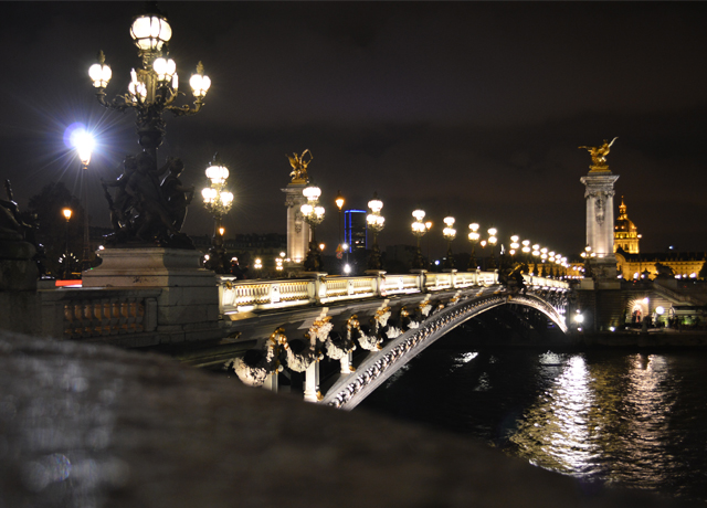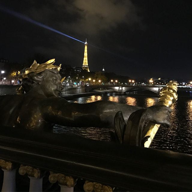 凱旋門からエッフェル塔までゆっくりと徒歩で散歩した夜のフランスの街並み。アレクサンドル3世橋から見渡すセーヌ河とエッフェル塔がとても綺麗だった。