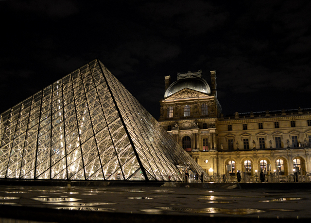 日が暮れるとガラスのピラミッドがライトアップされ幻想的に。