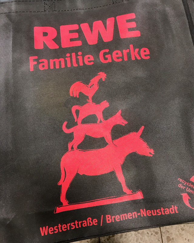 ちなみにブレーメンのREWEスーパーのエコバッグはお馴染みの動物の音楽隊デザインでした。