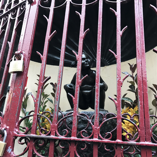 小便少女は小便小僧に便乗して、後から建てられたそう。南京錠付きの鉄格子が立てられていて厳重なのは、像に触る人が多く塗装が剥げやすくなってしまったからだそう。