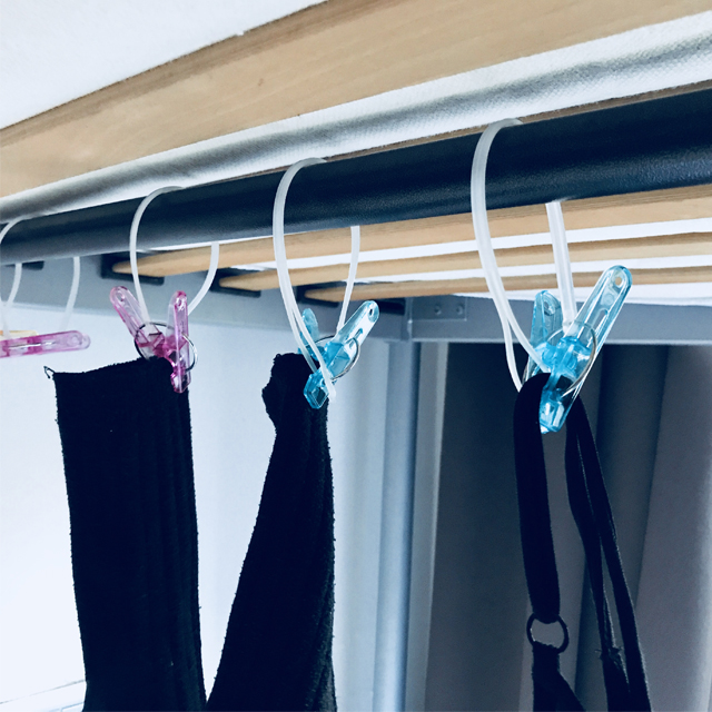 干す時はダイソーのひも付き洗濯バサミが大活躍。二段ベットのパイプに吊り下げることが出来たりとても便利。