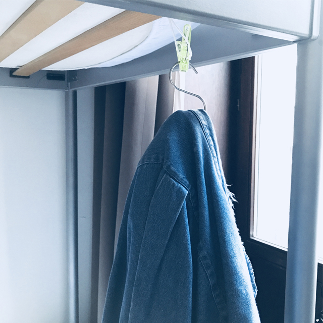 そこで利用するのが二段ベットのパイプや木枠の骨組み。パイプがない場合は洗濯紐やロープの出番になります。