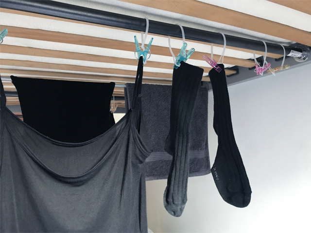 洗濯物の干すスペースは?って思いますよね。ハンガーはかさばるのでわたしは持っていかない派です。
