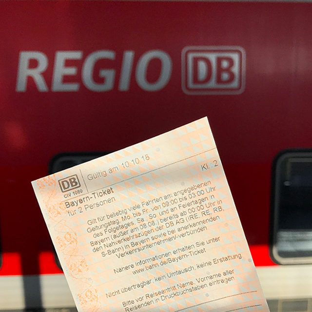 バイエルンチケットとはドイツバイエルン州のRB、RE、Sバーンといったローカル列車に乗り放題のチケット。まるで日本で言えば青春18切符と似ていますね。ミュンヘン、ニュルンベルク、アウクスブルクではトラム、地下鉄、郊外のバスにも使えます。