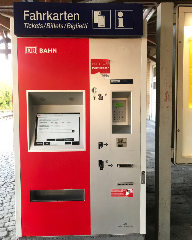 今回は下記の写真のDB(ドイツ鉄道)の赤い券売機で購入しました。日本語表示がある券売機もあるそうなのですが、今回はなかったのでドイツ語での説明になります。窓口でも購入可能なのですが手数料が2ユーロかかります。