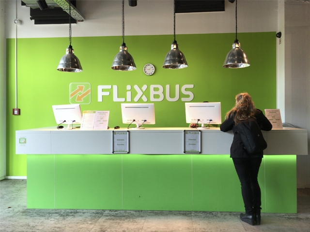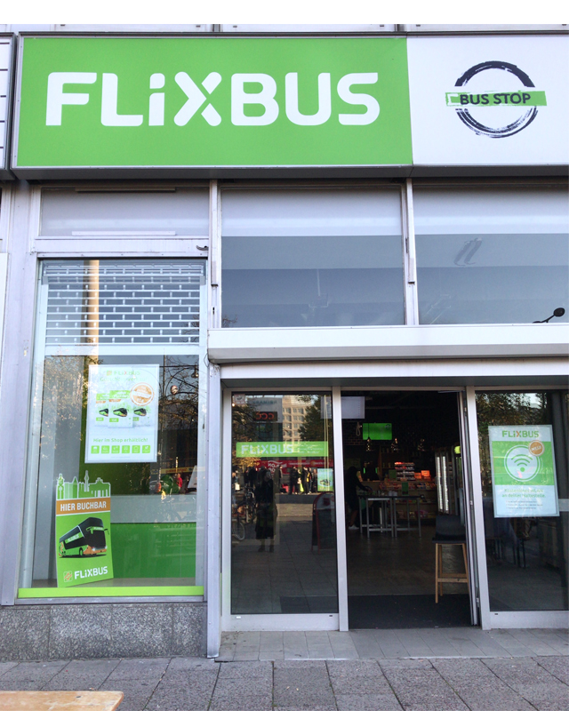FlixBusのトレードマークは鮮やかなライムグリーン。バス車体から支店までライムグリーンで目立っていてわかりやすいです。