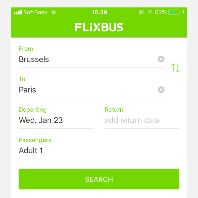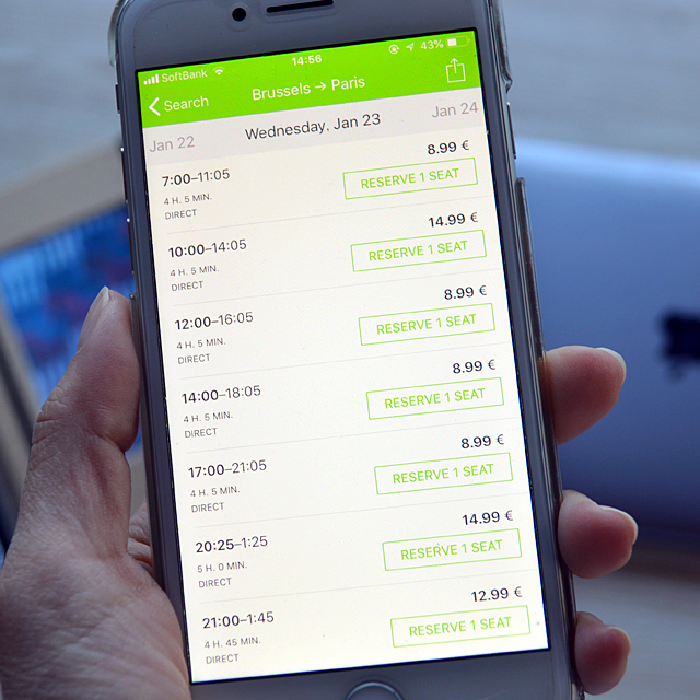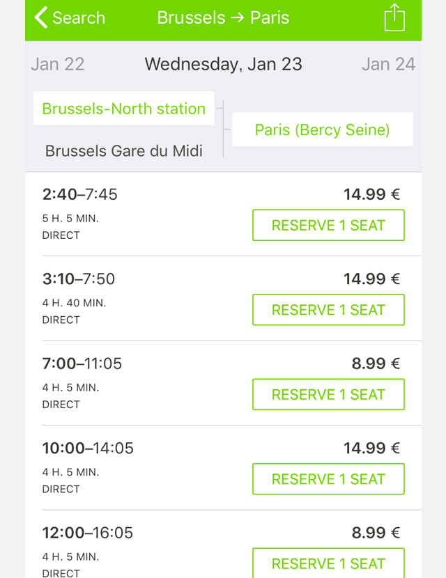 ベルギーからフランスへ国境をまたぐ約4時間の移動なのに最安値€8.99と驚きの安さ。わたしが今回予約した中で一番安かったのはハンブルクからブレーメンへ向かう€4.99と格安でした。